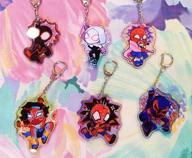 Miles Morales & friends swinging your way! Double sided 2.5" acrylic charms with a unique design on each side, with a smooth epoxy finish.